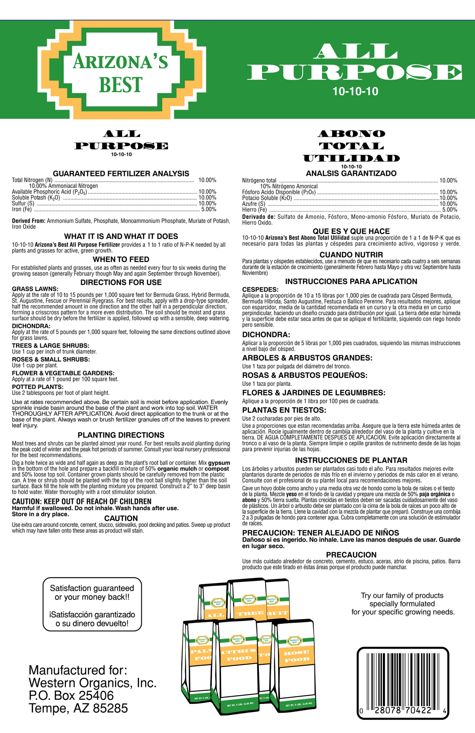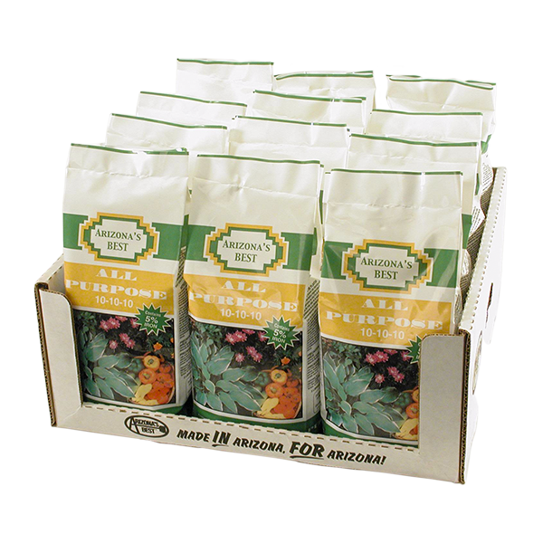 Arizona’s Best All Purpose Fertilizer provides a one to one ratio of N, P and K needed by all plants and grasses for active and green growth. Use on established plants and grasses, use as often as needed every four to six weeks during the growing season (generally February through May and September through November).