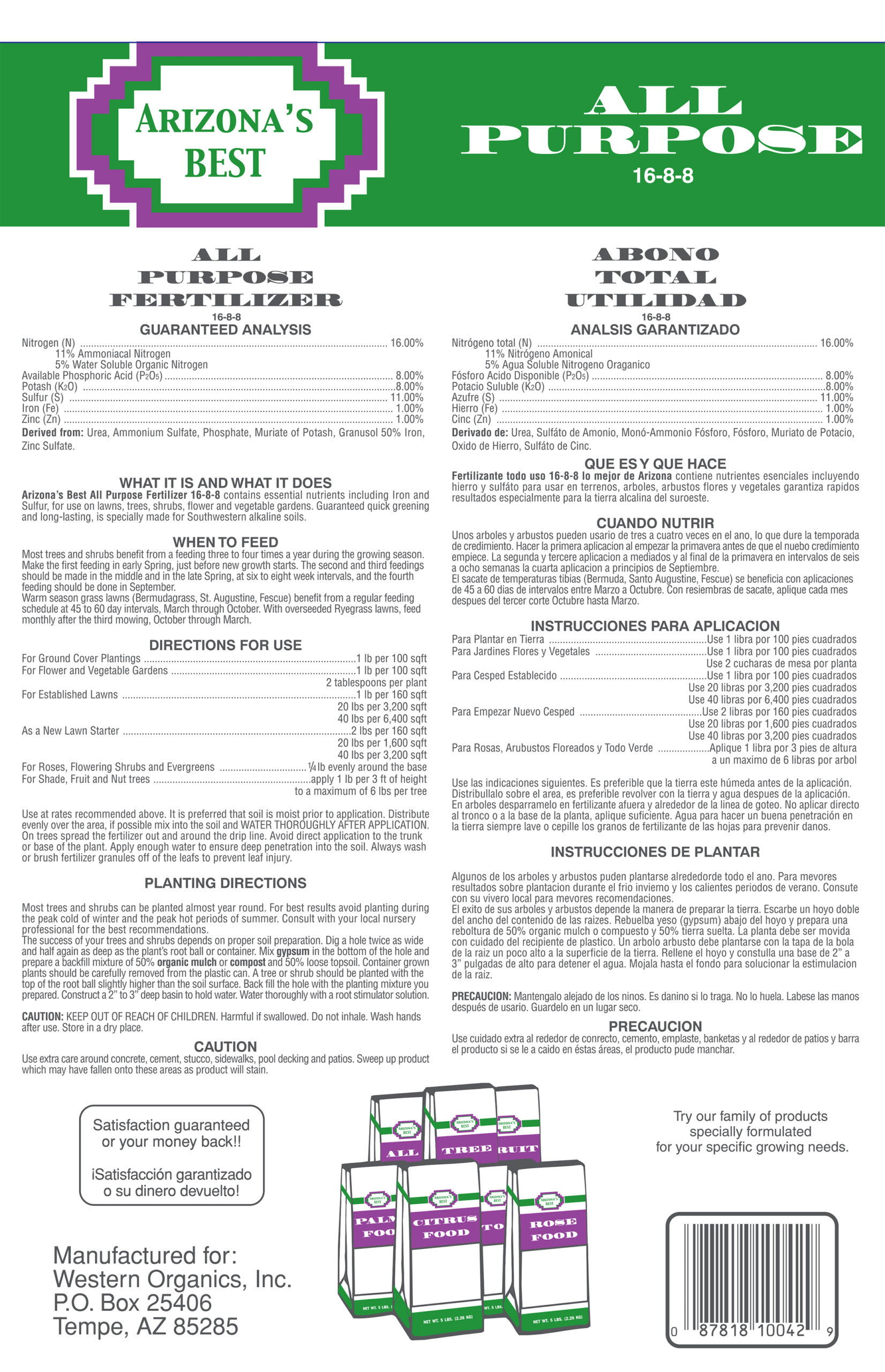 Arizona’s Best All Purpose Fertilizer has an N, P and K ratio of 16-8-8, and contains essential nutrients including iron and sulfur making it great to use on lawns, trees, shrubs, flowers and vegetable gardens. Quick greening properties and long-lasting formula made specially for Southwestern alkaline soils.
