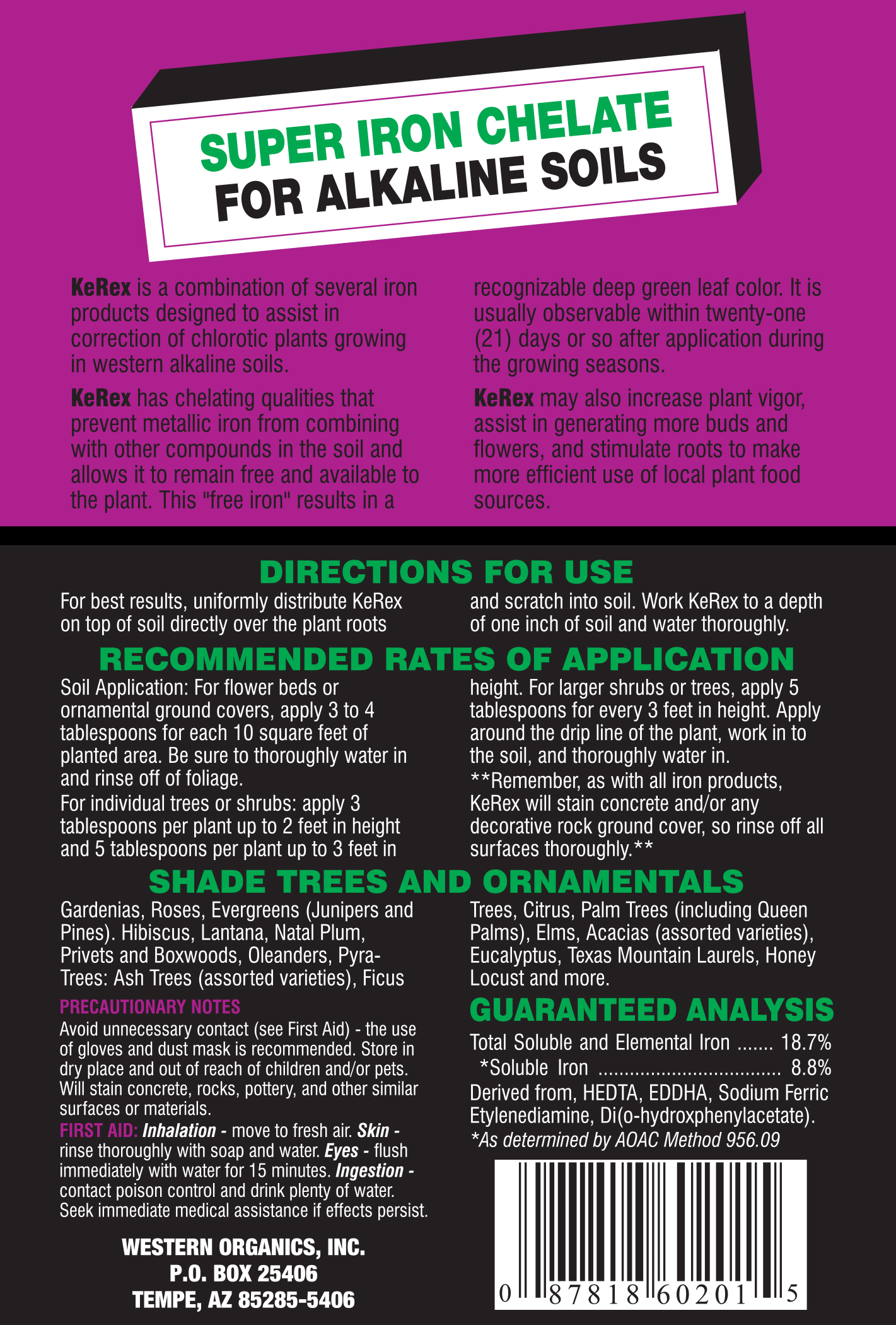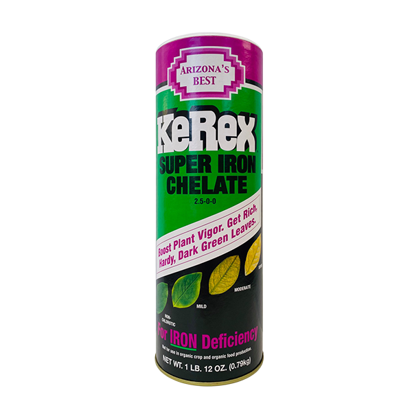 Arizona’s Best KeRex is a combination of several iron products designed to assist in correction of chlorotic plants growing in Western alkaline soils. It is specially formulated to contain chelated iron, which is more readily available to the plant for quicker results. Greener leaves and the correction of chlorotic conditions are usually observable approximately twenty-one after application during the growing seasons. KeRex may also increase plant vigor, assist in generating more bud and flowers and encourage vigorous roots.