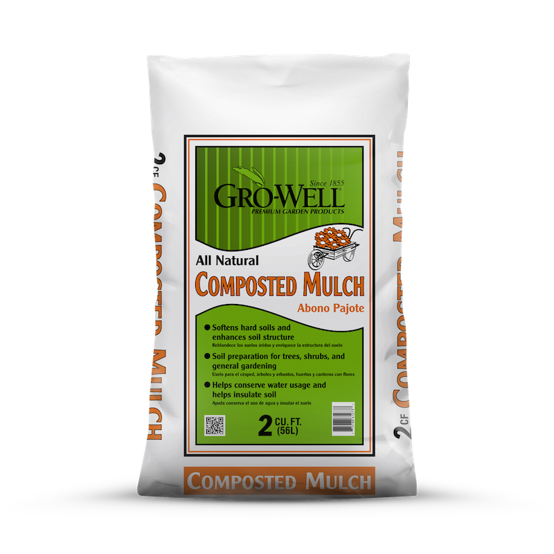GRO-WELL Composted Mulch is a natural organic product that is regionally formulated for improved soil structure and growing environments. The ingredients and large sizing make it a naturally good soil amendment to mix into existing soil when planting trees, shrubs, planting beds, gardens and anywhere else coarser composted mulch is desired. Can also be used as a ground cover mulch that can help conserve water and insulate the soil to make life a bit easier on your trees and shrubs root zones during those periods of harsh climate.