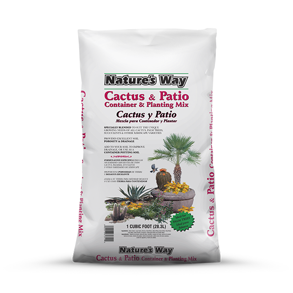 Nature’s Way Cactus & Patio Container & Planting Mix is a specially blended soil that contains natural occurring lava sand and an all organic slow release fertilizer to suit the unique growing needs of all cactus, palm trees, Xeriscape plants and succulents. Cactus & Patio also provides excellent soil porosity and drainage.